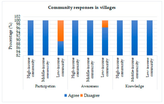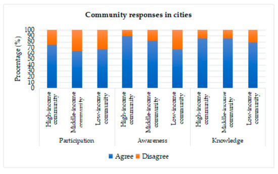 The response of people living in urban areas is illustrated through the graph in Figure 8. Overall, there were still views of urban communities that had not provided support for the existence of green-roof in residential areas. People from low, middle, and high-income groups showed less support in the aspect of participation. Specifically, for low-income people in urban areas, the number of support was less than optimal, both in the aspects of participation, awareness, and knowledge.