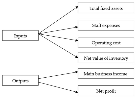 First, we established the input-output model to calculate the total factor productivity (TFP) of an enterprise. The operation process of a retail enterprise is essentially an input-output system, and most scholars will focus on indicators related to assets, labor, and costs in the construction of its input-output indicator system [23,67] as the input index, and indicators related to revenue and profits as the output index [68,69]. Based on existing research, we constructed the input-output model with four inputs and two outputs (see Figure 2).