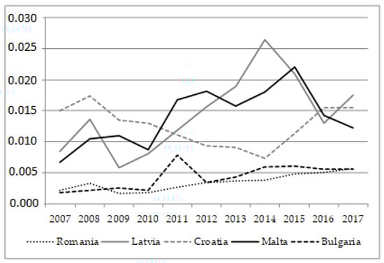 Furthermore, the dynamics of the worst performing countries are depicted in Figure 1, showing changes over time. This set of countries has faced problems in the last two decades, which have contributed to the current state of affairs. First, the majority of the worst performers include countries that have transitioned from a planned economy to a market economy. In those years of transition, these countries had other focuses outside of innovation and R&D policies. The main issues concern the business practices and legislation that need to be harmonized within European Union countries, as the majority of these countries are newer European Union member states. Some of these countries have a weak linkage between the business sector and the academic sector []. Malta faces problems with micro-enterprises (dominating over 95% of total business) within the private sector, which have limited resources regarding innovation and R&D, limited financing, and are vulnerable due to facing riskier R&D activities []. Other problems include high-skill sector labor shortages in Bulgaria and Romania, alongside highly-educated population emigration [], a problem that is present in Croatia as well, where over the 2000–2010 period the total number of full-time equivalent (FTE) researchers decreased by almost a quarter []. Furthermore, Croatia’s other problems include a low level of public funding for research and a very fragmented research and innovation (R&I) system []. Finally, Latvia faces problems of low productivity and low capacity for absorption of new technologies [], alongside low rates of risk-taking and entrepreneurship [].