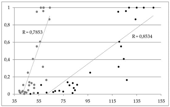 Next, the newest rankings from the European Innovation Scoreboard (EIS) [] and Global Innovation Index (GII) [] were obtained and compared to the rankings of the DEA model for the year 2017. The results are shown in Figure 2, where grey dots represent the scatter plot of DEA scores and the EIS values, whereas black dots depict the scatter plot of DEA scores and GII values. The correlations between the rankings are again very high, with over 78% correlation for the EIS ranking, which is based on 27 different indicators, while the GII is based on more than 80 indicators. Since the approach in this paper obtained similar rankings based on 12 variables, it can be said that (i) the rankings obtained in this research are reliable, as they are similar to those of international institutions; (ii) that such an approach can be used in the future to obtain meaningful results with less data, time, and resources; and (iii) that Figure 2 again confirms the validity of the previously obtained results.