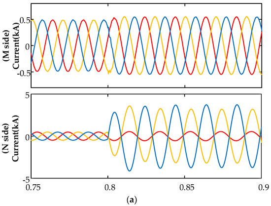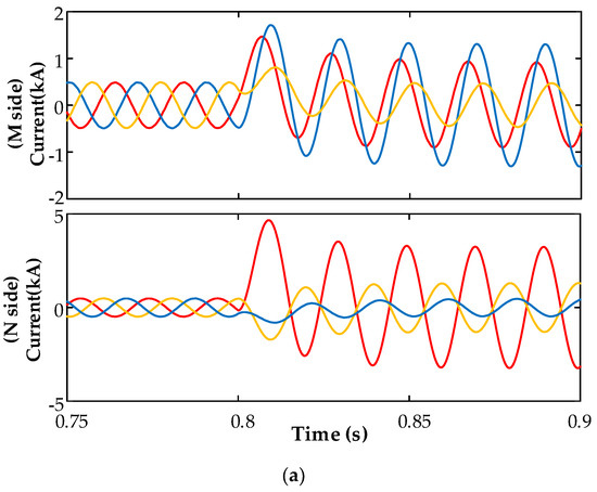 Figure 7 illustrates the simulation results of the internal AG fault occurs in f1. The simulation waveforms of the fault current under the AG fault at f1 are depicted in Figure 7a. It is demonstrated in Figure 7a that the fault current characteristics on the M-side are remarkably different from those of the N-side. The fault current of the M-side is mainly composed of a zero-sequence component, and the phase angles of the three-phase fault current are roughly the same.