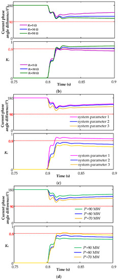 The operating characteristics of the current differential protection with different active power references under BC fault with 5-Ω fault resistance is depicted in Figure 8d. As the active power references increases, the current phase angle difference of phase-C is an obtuse angle, and Kc will be less than 0.8. Therefore, the current differential protection will operate incorrectly.