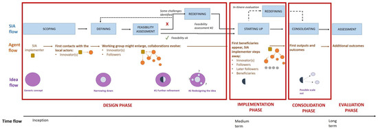 Conceptual flows of the Social Innovation Action (SIA) process through the design, implementation, consolidation, and evaluation phases. SIA flow: the process through which a social innovation idea is developed into a concrete initiative (consolidation); agent flow: the evolution and enlargement of the actors´ network along the SIA process; idea flow: the evolution of the social innovation idea from broad to narrow (i.e., operationalization). Source: own elaboration.