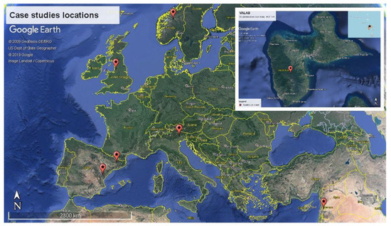 The areas in which the seven SIAs were initiated are located in France (overseas region), Lebanon, Italy, Norway, Spain, and United Kingdom (Figure 3). These different European and Mediterranean areas were chosen to include social innovation processes in a variety of fields (forestry, agricultural, and rural development sectors) and contextual conditions [42]. Common variables across cases were: (i) being a rural or intermediate rural area (using the conceptualization of Price et al. [43]), (ii) presence of one (or more) marginalization indicators, and (iii) whether the initiative could be considered a social innovation according to Polman et al. [15]. Appendix A provides more information on the check-list used. The marginality was assessed using a three-fold perspective [43]: