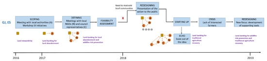 The definition of the main social innovation around which the local actors decide to work to alleviate the needs of the local society is a key milestone of the SIA process. While all actions eventually identified an idea to be developed, the original idea never stopped evolving at any point during the designing phase. As an example, in the ES1 case, the topic of the SIAs changed three times during the process of designing (from a broad land stewardship-type of initiative, to land banking for wildfire risk prevention), and was additionally refined during the implementation of the idea (towards farmland recovery for traditional mountain varieties) (Figure 4). Redefining an idea repeatedly during a design thinking approach is widely recognized as a key feature of creativity, and a likely approach to achieve concrete results [54,55].