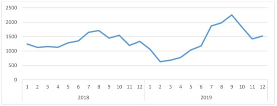 The issues of sustainability in maritime transport and logistics services have been considered in terms of environment, economy, and society. Recently, a substantial amount of research has been conducted on the improvement of energy efficiency and the use of cutting-edge technology [1]. While there are many concerns about the ongoing US–China trade conflict and the proliferation of global protectionism, in-depth research is lacking. Trade volume and maritime logistics services are closely linked, and sea freight prices have fluctuated widely since January 2018, as illustrated by the trend of the Baltic Dry Index (BDI) in Figure 1. The BDI is a shipping cost index, which is used to be a leading indicator of future economic growth.