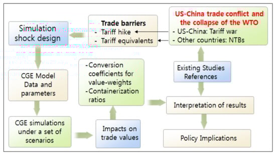 The protectionism triggered by the US–China trade friction will spread around the world in forms of NTBs. It is said that global trade is exposed to protectionism more frequently and with higher strength, as envisioned by Foreign Policy [61], WTO [3,4,5], and the UN [11]. This paper tries to take these issues into account in a scientific approach, as demonstrated in Figure 2. Based on previous studies, the levels of global protectionism as a tariff and non-tariff trade barrier (tariff equivalent) are assumed, which will be assigned to the dynamic CGE model to estimate the impact on the global trade flow. Trade-cargo-container conversion explored by Lee et al. [62] for the first time in academic papers, as well as Cheong and Suthiwartnarueput [31] and Cheong and Cho [63] will be applied to trade estimates to calculate the impact on global logistics demand. Major findings using the trade-cargo-container conversion approach is summarized in Table 1.