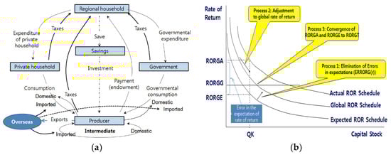 The left figure of Figure 3a summarizes the model structure of GTAP, while the right Figure 3b shows regional investment adaptation mechanism with a complicated structure of equations, coefficients and database. There may be temporary imbalances in investment, but simulations continue to converge until the model arrives at another full equilibrium. If, for some reason, the rate of return (ROR) on investments of an area rises, the world’s inflow of investment increases according to the adaptation coefficient. A detailed explanation is given by Ianchovichina and Walmsley [65].