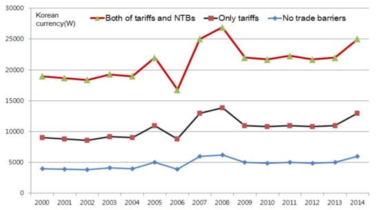 TEs can be over 100% depending on the measures as seen in the case of Korea, but the TEs in Cadot, et al. [69] were taken for this paper. It may be controversial, but for the sake of convenience, we will set TEs 15% as the baseline scenario and 10% and 15% as alternative scenarios. The tariff and NTBs scenarios are summarized in Table 5.