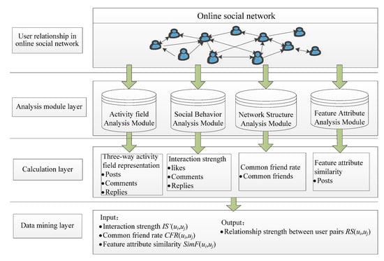 A new model of relationship strength measurement is proposed in this paper (Figure 1). It consists of four layers: (1) Users in an online social network layer. Attribute and interactive information can be achieved from this layer. (2) Analysis module layer. It is the main part of the model and consists of four analysis modules includes activity field analysis, social behavior analysis, network structure analysis and feature attribute analysis. (3) Module calculation layer. Utilize the information extracted from the first layer to calculate the analysis modules layer. (4) Data mining layer. Taking interaction strength, common friend rate and the similarity of the feature attribute as input to achieve the relationship strength between user pairs in online social networks.