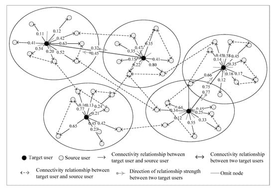 For the measurement about the relationship strength between users, lots of methods were proposed recently, which could be categorized by utilizing the user’s feature information [], topology of networks information [] and interactive information []. The user’s feature information can provide an overview of personal characteristics, including the user’s profile information and the following information. The profile information contains gender, age, education, work experience, hobbies, religious views, etc. The following information involves the public account, topic, field that is followed by users. Luarn and Chiu [] predicted the relationship strength by the similarity of the profile information and interaction data between users, thus distinguished the strong and weak relationships on social network sites. Ju and Tao [] estimated the user’s similarity based on the profile information and the following information of the official accounts that is concerned by users. Then, the similarity, timeliness and interaction were confused to improve the accuracy of the relationship strength calculation to some extent.
