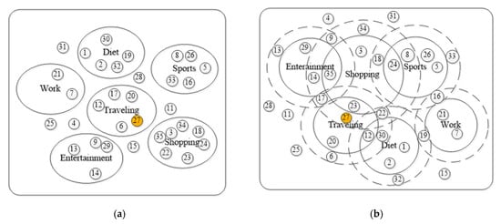 An issue related to the existing research about the relationship strength measurement in activity fields is more likely based on two-way (i.e., binary) decisions. It is described by a single set, where every activity document plays the same role in this field. In other words, there are two regions to represent an activity field (Figure 3a), namely, the positive (i.e., in) region and the negative (i.e., out) region. If an activity document is in the activity field, that means it is in the positive region. If an activity document is not in the activity field, it is classified into the negative region. With this mode, an activity document in the online social network can only belong to one field. But it is more complex in reality that an activity document may belong to several activity fields simultaneously. Such as the post content “I have a nice impression on this Hong Kong trip, the most delicious food is Kau Kee Food Café, and the cheapest cosmetic is Bonjour.” This post is mainly about a traveling experiment, but also related to diet and shopping. Therefore, it is inadequate to assign the activity field to an activity document only by two-way. By borrowing ideas from the three-way analysis [], this problem is resolved by introducing a third region of the activity field, namely, the boundary region (Figure 3b). With this three-way mode, an activity document can be both in the positive region of several fields or in the positive region of one field and the boundary field of another field. Figure 4 shows activity document distribution scenarios by two-way method (Figure 4a) and three-way method (Figure 4b) in online social networks. The small numbered circle indicates the active document. Take document 27 (orange circle in Figure 4) as an example, it can belong to the positive region of the traveling field and the boundary region of the shopping field concurrently, while only in the traveling field by the two-way method.