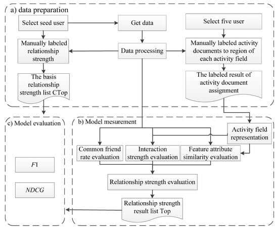 Personalized recommendation has become a research hotspot as the volume of data on e-commerce platforms continues to grow at an exponential rate, it provides an unprecedented development for precision marketing and dynamic supply chain optimization []. In real applications, due to inaccurate recommendation results, personalized recommendation service faces the problem of unsustainable development []. Some literature has proposed some solutions recently [,], traditional recommended systems usually adopt collaborative filtering algorithms [,] and content-based filtering algorithms [,], but this strategy cannot solve these issues well and meets bottlenecks to improve the accuracy of recommendation results. The experiments of literature in recent years suggest that relational social information is very effective in improving traditional recommendation algorithms [,]. Relationship strength, as known as tie strength, is an important part of relational social information, and its application can promote the sustainable development of personalized recommendation services. The notion of tie strength is a “combination of the amount of time, the emotional intensity, the intimacy (mutual confiding) and reciprocal services”, which was first proposed by Granovetter [] in 1973. Many approaches have been proposed to solve the problem of relationship strength measurement [,]. However, one problem in existing approaches is that they neglect the fact that different users have different activity field preferences due to their interests. It will affect the user’s interaction choice for different activity fields. A simple example is used to illustrate this point. If a user enjoys eating but does not like sports, he may pay more attention to the posts related to the “diet” field rather than the “sport” field, generating frequent interaction in the “diet” field instead of the “sport” field. Furthermore, the high frequent interaction between the user and his friends is not just for their strong relationship strength but may be because the posts published by these friends are most related to the “diet”. The reverse is true where the low frequencies of interaction with other friends are not only due to the weak relationship strength, but due to these friends’ stronger motivation to post about “sport” than “diet”. In addition, various individuals have different interactive habits, which will affect their behavior to generate the interactive frequency and interactive types. For instance, some users have less interaction due to their taciturn personality rather than disfavor or disapproval, while other users are habituated to give likes; and so on. Therefore, it is necessary to study the relationship strength in combination with the individual’s activity field preferences and interactive habits.