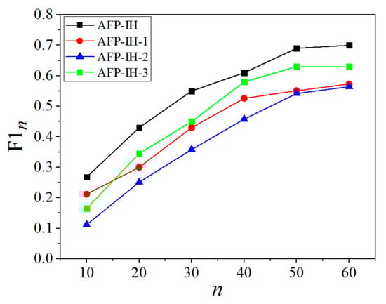 Firstly, various methods are compared with different n based on the evaluation metric of F1n. The result in Figure 6 shows that as n increases, the value of F1 gradually increases, indicating that the performance of the relationship strength measurement model increases with the number of users. What is more, the evaluated value (F1) of AFP-IH is the largest under different n, indicating that the performance of AFP-IH is better than the other three models.