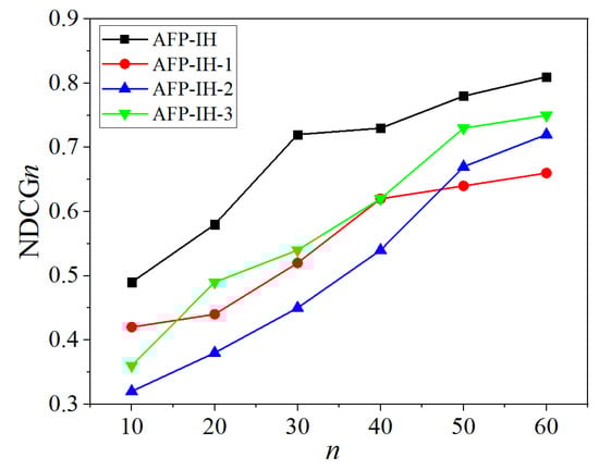 The NDCGn of various methods with different n. (AFP-IH: the method considers the user’s activity field preference and interactive habits, and uses the three-way method to represent the activity field; AFP-IH-1: the method neglects the user’s activity field preference; AFP-IH-2: the method ignores the user’s interactive habits; AFP-IH-3: the method uses the two-way method to represent the activity field).