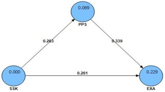 Figure 2 shows the structural analysis model of the effects of positive psychological strength (PPS) as a mediating variable. This indicates the structural path, revealing an acceptable relationship. The strengths of the relationship between the variable are, thus, SSK (β = 0.261, t = 1.99, p < 0.05), EXA (β = 0.339, t = 2.98, p < 0.05), and PPS (β = 0.339, t = 2.87, p < 0.05). The value of mediation is sufficient when (f2 > 0.08.) This demonstrates the value of study skills and their relationship with positive psychological strength. The mediation between positive psychological strengths (PPS) and examination anxiety is identified as effective and significant. Therefore, positive psychological strengths (PPS) acts as an effective mediator towards examination anxiety.