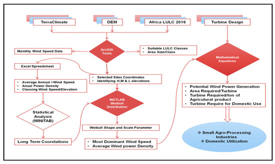 In this study, the potential of wind energy, most appropriate locations, and suitable wind turbine designs were determined using a multidimensional approach (remote sensing, GIS, mathematical models, and utilization). The combinations of the selected approaches can be considered as an additional method to previous findings in the literature. The step-to-step procedure of this research work is detailed in Figure 1. It consisted of six sections: suitable locations in terms of topography and land use land cover (LULC) (Section 3.1) in order to identify the most appropriate locations; wind speed data (Section 3.2) in order to extract wind speed data from the world map and then collect data for each selected point based on the locations identified in Section 3.1; statistical analysis (Section 3.3) in order to identify the relationship between wind speed and wind power density at the three selected levels of elevations in the study area, Minitab software was used to perform ANOVA; study and model the most suitable wind behaviour, i.e., based on topography and monthly variation (Section 3.4); design a model wind power turbine with standard technical specifications that will suit the wind regime of the study area (Section 3.5); and finally, estimation of the energy requirement for small agro-processing units to improve agricultural productivity and upgrade food quality in order to eliminate poverty in the study area (Section 3.6).