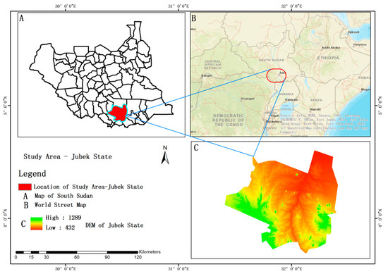 The study area was located in the Southern part of South Sudan Figure 2B; it was one out of 32 states of the country, which hosts the capital city of the country. Jubek state covers about 18,313.7 km2 with surface elevation ranges between (432–1289 m) Figure 2C and is surrounded by four states, i.e., Terekeka, Torit, Yei, and Amadi, in the North, East, South, and West, respectively Figure 2A. It lies between the longitude of 31°25′55.021″ E and latitude of 4°42′42.444″ N and compromises fourteen counties: Dollo, LyriaRokon, Oponi, Lobonok, Rejaf, Gondokoro, Mangala, Ganji Bungu, (Ganzi), Lodu, Wonduruba, and Luri. Based on the 2014 census report, the population of Jubek State is about 492,970, and thus represents 40% of the entire population of South Sudan. The monthly rainfall is 100 mm/month from April to October and dries during December to February. The sunshine from September to February is almost 8 to 9 h in a day, and from March to August is about 6–7 h, as seen in Figure 2.
