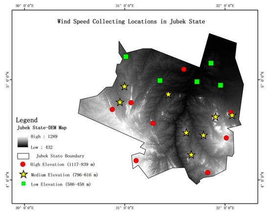 Figure 3 shows the three identified locations, i.e., H 1117–839 m, M 796–616 m, and L 588–458 m. A total of 21 wind speed collection points were divided as 7, 7, and 6 for H, M, and L, respectively. Coordinates of each location with elevation are given in Table 2. For each location, monthly wind speed data were collected for 19 years (2000–2018), making a total of 4560 wind speed data points (1596, 1596, and 1368 for high, medium, and low elevations).