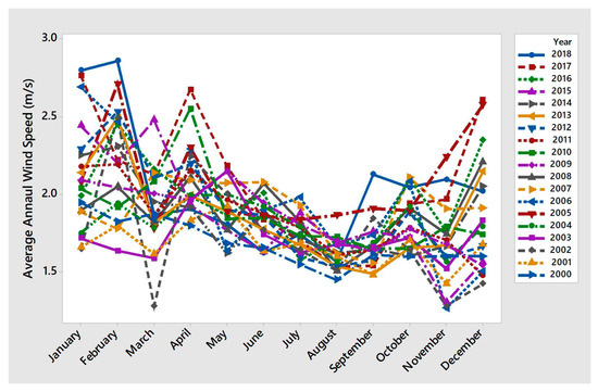 Monthly Wind speed variation at of the study area for 2000-2018.