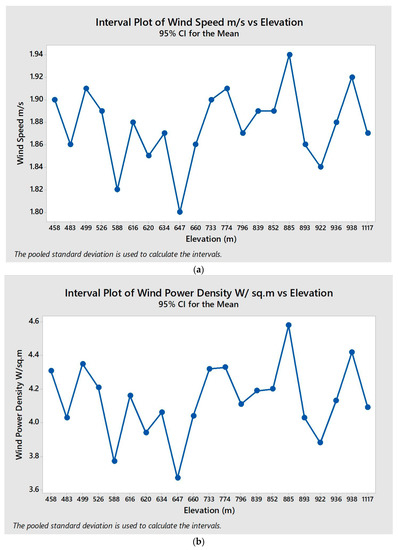 To identify the relationship between wind speed and wind power density with the three selected levels of elevations in the study area, we used Minitab software to perform ANOVA with α = 0.05.