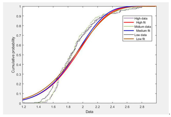 To find the optimum values of k and c parameters that correctly fit the wind speed and wind density data, the calculated average wind energy density by Weibull function was solved as an objective function to suit the actual energy. Table 9 and Figure 7 and Figure 8 show the wind speed data observed (represented by bars) and predicted (represented by line) properly fit in the Weibull distribution, the highest annual wind speed was found in H (1.87 m/s), and the same value was recorded in both M and L (1.85 m/s). Also Table 10 and Figure 9 and Figure 10, illustrate the PDF and CDF fitted to the Weibull distribution show the highest value of annual mean power density to be 4.6, 4.5, and 4.5 W/m2 at H, M, and L, respectively. The optimum values of k and c parameters were determined for the three selected types of locations.