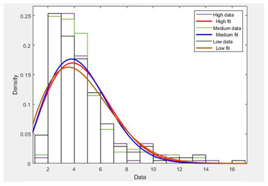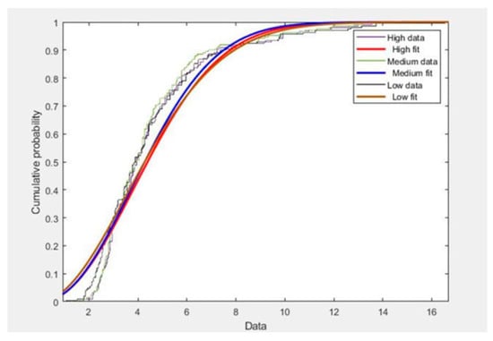 In the literature, various methods have been used in determining Weibull parameter shape and scale factors. The most well-known methods are moment, standard deviation, curve fitting, and power density, maximum likelihood. All the above methods were proven to have almost similar results [28], but for long time-series data, maximum likelihood is mostly recommended [21,22]. Therefore, in this study, maximum likelihood was chosen to determine k and c parameters using Equations (2) and (3), respectively.