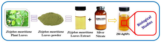 Interestingly, Z. mauritiana has been earlier applied for the preparation of other nanomaterials such as zinc oxide and gold NPs [24,25]. Furthermore, very recently ZM-LE has also been successfully used to obtain AgNPs [26]. However, the NPs from this method are prepared applying a photo-reduction method using sun light as reaction medium, which required long reaction time of more than two days. Moreover, the AgNPs obtained from this method are irregularly shaped and large in size. Therefore, herein, we have applied ZM-LE for the aqueous synthesis AgNPs via solution reduction of Ag ion in a short time period (cf. Figure 1). Detail investigation of the effect of time, temperature, and concentration of leaves extract on the properties of resultant NPs is performed. The NPs were identified using different microscopic and spectroscopic techniques. Furthermore, the antibacterial activity of phytomolecules functionalized ZM-AgNPs were tested against various bacterial strains.