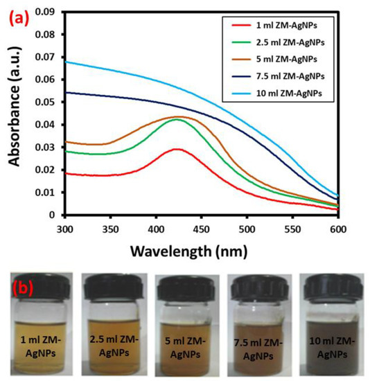 (a) UV-Vis analysis of as-synthesized silver nanoparticles (ZM-AgNPs) using various concentrations of ZM-LE (1, 2.5, 5, 7.5, and 10 mL) and (b) dispersion images of as-synthesized silver nanoparticles using various concentrations of ZM-LE (1, 2.5, 5, 7.5, and 10 mL).