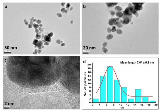 TEM images of as-synthesized silver nanoparticles using 1 mL ZM-AgNPs (a,b) overview, (c) magnified TEM image, and (d) particle size distribution graph.