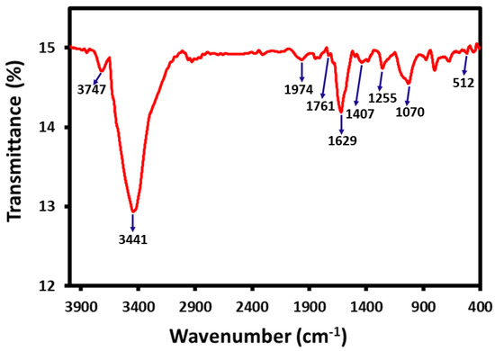 This was further confirmed by FT-IR analysis, which was used to identify the presence of residual biomolecules of ZM-LE on the surface of ZM-AgNPs as stabilizing agents. In order to remove the unbound phytomolecules, the sample was washed repeatedly before FT-IR measurement. For instance, freshly obtained ZM-AgNPs were redispersed in DI water through sonication (30 min), and centrifuged at 9000 rpm (30 min), and this procedure was performed twice to obtain pure ZM-AgNPs for IR measurement. Figure 7 exhibits the IR spectra of purified NPs. The FT-IR spectrum ZM-AgNPs exhibited several peaks, which indicates the presence of several important functional groups. Some of the prominent peaks include the peaks at 3747, 3441, 1761, 1629, 1407, 1255, 1070, and 512 cm−1 which can be attributed to the hydrogen bonded O-H group, C−H, C−C, and C−O stretching of aromatics, C−O stretching of alcohols, carboxylic acids, and ester groups, etc. [36]. In addition, these peaks revealed the presence of different compounds containing carbon and oxygen, thereby suggesting that silver nanoparticles might be capped by organic components of ZM-LE, which not only help to stabilize the surface of NPs, but also enhance the biological properties of these materials.