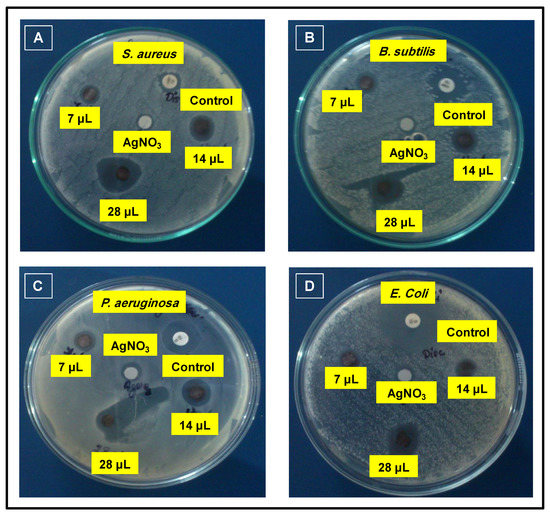 The antibacterial assay of ZM-AgNPs was performed against antibiotic resistant gram positive bacterial strains such as S. aureus, B. subtilus, and gram negative bacterial strains such as P. aeruginosa and E. coli, using the disc diffusion method. Streptomycin was employed as a control and the zone of inhibition value was calculated for different concentrations of ZM-AgNPs i.e., 7 μL, 14 μL, and 28 μL from (100 μg/mL). The different zones of inhibition obtained are given in Figure 8.