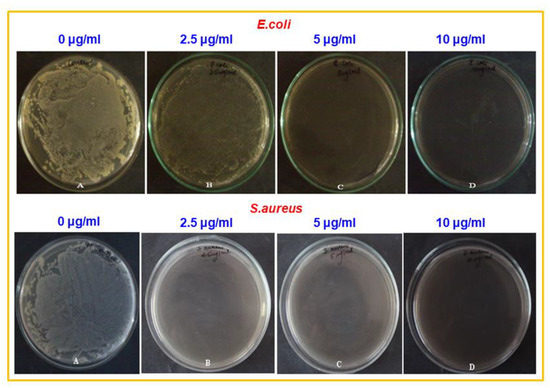 Furthermore, the minimum inhibitory concentration (MIC) value of biosynthesized ZM-AgNPs was calculated and the bacterial strains S. aureus and E. coli were selected for this study. In this study the bacterial strains, the E. coli and S. aureus were subjected to different concentrations of ZM-AgNPs (0, 2.5 μg/ml, 5 μg/ml, 10 μg/ml) and were also taken as controls without ZM-AgNPs. The ZM-AgNPs showed the highest level of activity against E. coli with the MIC value of 5 μg/mL, while for S. aureus, the MIC value was found to be 10 μg/mL, as shown in Figure 9.