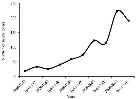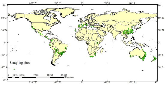 Distributional data for A. cordifolia were mainly obtained from the Global Biodiversity Information Facility (GBIF, https://www.gbif.org/). From GBIF and literature reports on the distribution of A. cordifolia worldwide from 1950 to 2018 [52], 1354 initial distribution points were selected. After filtering and processing, 897 unique distribution points were finally obtained (Figure 1). The accuracy of predictions is affected both by the accuracy of distribution points and the total number of points. To expand the volume of data, we generated pseudo-existence points as part of the modeling process. The selection and quality of pseudo-existence point data also affect the prediction results of the model. Generally, methods for generating pseudo-existence points are based on random generation, spatial data, or environmental factors. [53]. In this study, a global random point was created by setting the command of randomly generated pseudo-existence points in R ver. 3.3.2 (http://www.r-project.org/), and 2000 pseudo-existence points were generated for this modeling operation.