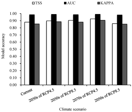 Evaluation of three indicators on current and future climate prediction models of the distribution of A. cordifolia. TSS (true skill statistics), AUC (area under receiver operating characteristic), and Kappa (Kappa coefficient).