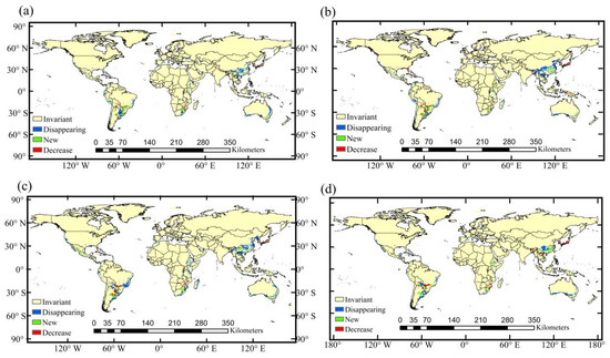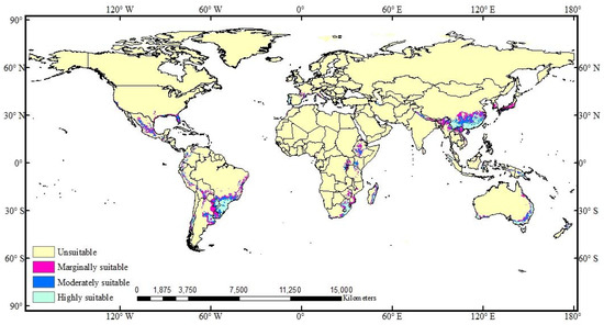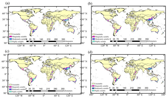 The four maps of Figure 6 illustrate that the area of highly suitable habitat first increases and then decreases, the marginally suitable area gradually increases, and the moderately suitable area first decreases and then increases. It can also be seen from Figure 6 that the area of suitable habitat in Asia and South America is obviously larger than that in other continents, and highly suitable habitat is concentrated in the regions near 30 °N and 30 °S of those continents. The predicted results show that the suitable habitat will increase over time, and the suitable area has an obvious band-like distribution (Figure 6), extending inland.