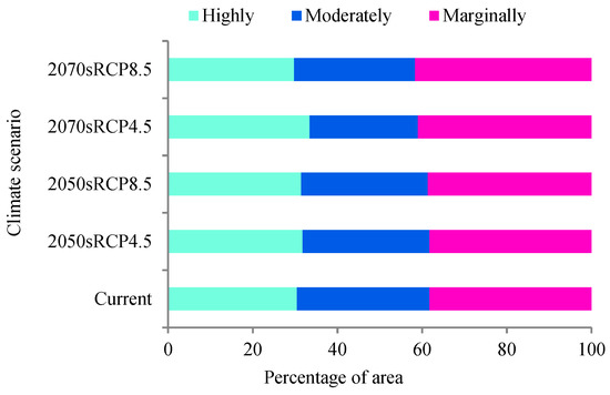 Proportions of three suitability classes for the distribution of A. cordifolia under different climate scenarios.