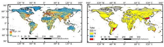 Human footprint map and global distribution map of A. cordifolia under the influence of human activities in current period. (a) Global human footprint dataset of 2009; (b) (Ⅰ) areas with the strongest human activities and high suitability distribution area; (Ⅱ) areas with strong human activities and moderately suitable distribution area; (Ⅲ) areas with weak human activities and marginal suitability distribution area; (Ⅳ) the area where human activities are the weakest and unsuitable distribution area.