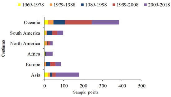 According to our results, from 1969 to 2018, the annual growth rate of sampling points of A. cordifolia was the highest in Oceania, followed by Asia and South America (Figure 9). Human activities are intensive in these areas. The intensity of human activities in Eastern Asia and India, Western Europe, and Eastern North America, from 1995 to 2010, is significantly larger than other regions, for various reasons, including global CO2 emission concentration, population density, and economic factors related to GDP [80]. From the human footprint map (Figure 8a), it can be seen that the human activity index of these countries is also in a high state. Comparing the predicted results against the current distribution, in some warm temperate regions, such as Eastern Australia and Southeastern Asia, the extent of highly suitable habitat of A. cordifolia clearly exceeds the current distribution, suggesting a high risk of expansion that is dependent on those human activities that favor this species.