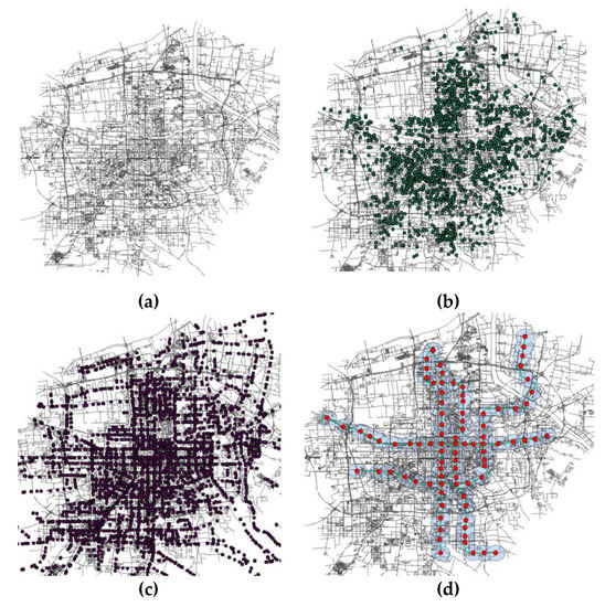 Data spatial distribution in Xi’an, China. (a) Urban road network spatial distribution. (b) Housing spatial distribution. (c) Bus spatial distribution. (d) Metro spatial distribution.