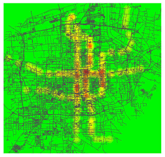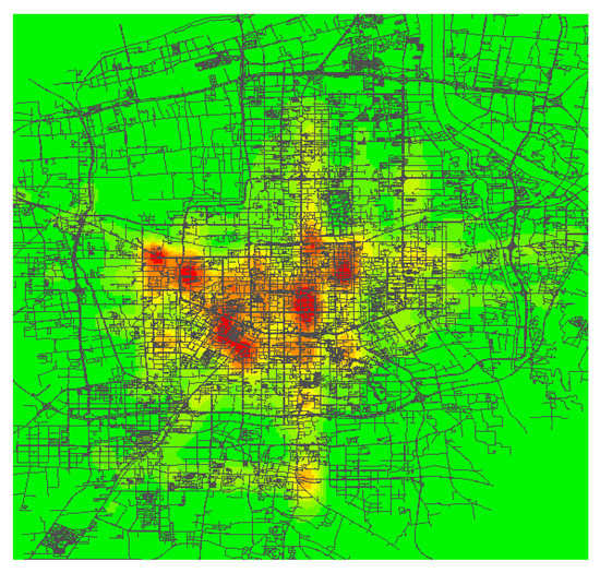 When calculating the bus accessibility, first calculate the shortest path length from a bus stop to all bus stops through the ArcGIS software, where the path is obtained based on the real urban road network map. Secondly, calculate the accessibility of each bus stop through Formula (1). Then generate the thermodynamic diagrams of bus accessibility by using the kernel density estimate, as shown in Figure 3. Finally, the bus accessibility is associated with the house price attribute table through nearest neighboring analysis, regarding it as the characteristic index of the house’s bus accessibility.