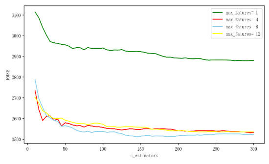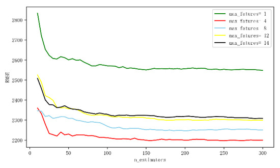 Before starting, we mark the real estate price estimation model without transport indexes based on the RF method as M3 and mark the real estate price estimation model with transport indexes based on the RF method as M4 for the convenience of expression. When building M3 and M4, there are two model parameters that need to be adjusted, which are max_features and n_estimators. max_features represents the maximum number of features that nodes of the decision tree participate in judgment during classification. n_estimators represents the number of decision trees when constructing a random forest. Figure 6 and Figure 7 respectively show the parameter adjustment curve about M3 and M4.