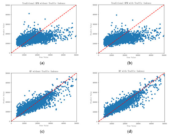 According to Figure 8, compared with the RF method, the traditional HPM method has a lower accuracy in real estate price estimation. In addition, transport indexes (bus accessibility and metro accessibility) play an important role in improving the model accuracy. Table 3 shows the comparison of prediction accuracy, prediction error and running time of the four models in the testing set.