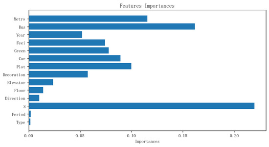 Buses and metros are the main ways of travel for city residents. Figure 9 shows the contribution of 14 features in the real estate model, which represent the importance of each feature in the model construction.