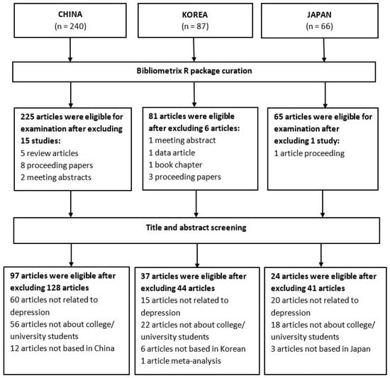 After retrieving data from the Web of Science Core Collection, 225 studies in China, 87 studies in Korea, and 66 studies in Japan before 2019 were identified. Utilizing the Bibliometrix R package, 15 studies in China, six studies in Korea, and 1 study in Japan that are not research articles were excluded. After that, the remaining articles’ titles and abstracts were screened independently by two authors. One hundred twenty-eight studies in China, 44 studies in Korea, and 41 studies in Japan were excluded because they were not related to depression, not about college/university students, and not conducted in the selected country. Eventually, 97 articles in China, 37 articles in Korea, and 24 articles in Japan were eligible for inclusion in the Scientometrics study (see Figure 1).