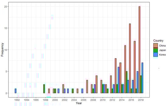 From 2008 to 2018, China, Korea, and Japan experienced significant growth in the number of publications. The percentage of publications produced during this time accounted for 77% (77/115), 80% (32/40), and 71% (20/28) in China, Korea, and Japan, respectively. Notably, the total publications of China were double the summation of total publications in both Japan and Korea. By raising its number of publications by ten folds in the last ten years, China obtained the clearest surge in terms of publication quantity. Compared to China, despite the increase in the total number of publications, the publication growth rates of Korea and Japan have been relatively fluctuating over time.