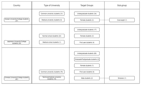 For the variety of target groups, China was also outstanding compared to its counterparts with five target groups and a sub-group, which was male smokers [38]. The target groups of studies in Japan were more diverse than those in Korea with three different target groups. Although there were only two target groups that were studied in Korea, researchers delved into the character of female students [39].