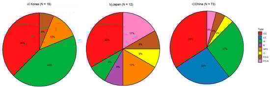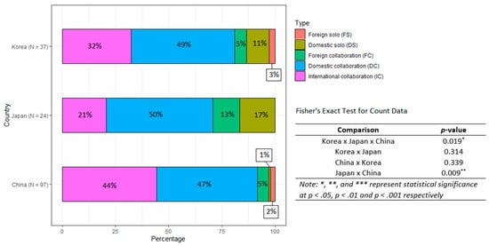 The Fisher exact’s test was employed to examine the difference in the proportion of collaboration types among Korea, Japan, and China. The collaboration proportion among Korea, Japan, and China is statistically significantly different at p < 0.05. The differences in collaboration type proportion of China–Korea and Korea–Japan were found to be statistically insignificant, while the difference between China and Japan was found to be statistically significant at p < 0.01