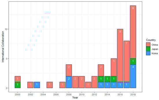 The USA was the most frequently collaborated partner of China, Korea, and Japan. In three countries, Korea was the most frequent country to collaborate with the USA with 75% (9/12) of total international collaborations. China and Japan’s collaborations with the USA accounted for roughly 63% (27/43) and 60% (3/5) of total internationally collaborated papers. In terms of the variety of partners, China had a broader collaborating network across Asia and Europe than Korea and Japan (see Table A1).