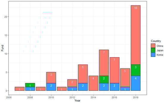Table 2 shows the Fisher’s exact test result regarding the difference in the percentage of funds provided and the percentage of government funds provided among Korea, Japan, and China. The results suggest a statistically significant difference between the proportion of funds provided in China and Japan. Interestingly, even though the proportion of funds provided is not different between China and Korea, their proportion of government funds provided is statistically significantly different. In general, the funding proportion and government funding proportion among Korea, Japan, and China were statistically significantly different.